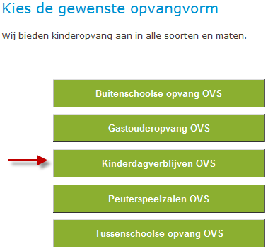 Als een ingelogde ouder opvang wil aanvragen voor een nog niet ingeschreven kind, kan hij kiezen voor dagopvang (er is een groene knop KDV toegevoegd aan de lijst met opvangsoorten):