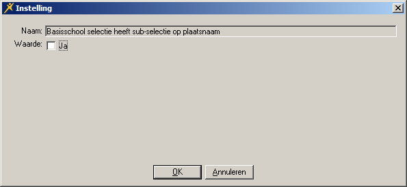 Als de parameter Basisschool selectie heeft sub-selectie op plaatsnaam is ingesteld op Ja, dan moet de ouder in de webpagina waarin hij een opvanglocatie kiest eerst aangeven in welke plaats zijn kind op school zit. In de webpagina wordt dan een keuzelijstveld getoond met plaatsnamen. Zodra de ouder een plaatsnaam selecteert worden de bij die plaats behorende basisscholen getoond. Als de ouder een van deze basisscholen selecteert worden de bij die basisschool behorende BSO-locaties/TSO-locaties getoond.