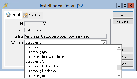 Met de parameter Aanvraag - Gastouder product voor aanvraag geeft u aan welk product wordt gebruikt in flexkids om de aanvraag te verwerken. Als u geen opvangproduct selecteert komt de aanvraag weliswaar binnen als mutatieverzoek in flexkids, maar dan kan deze niet worden verwerkt. Pas als een gastouderopvangproduct is opgegeven in voornoemde flexweb-parameter kan het mutatieverzoek worden verwerkt.
