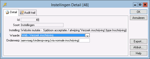Als een bestaande ouder zichzelf en zijn kind inschrijft via het inschrijvingsportaal en opvang aanvraagt, dan wordt dit als een zogenoemd mutatieverzoek zichtbaar in flexkids. Met de parameter Website mutatie – Sjabloon acceptatie / afwijzing 'Verzoek inschrijving' (type Inschrijving) stelt u in welk sjabloon gebruikt wordt voor het e-mailbericht dat naar de ouder wordt gestuurd zodra het desbetreffende mutatieverzoek is afgehandeld (geaccepteerd, ingetrokken, afgewezen of in de wacht gezet).