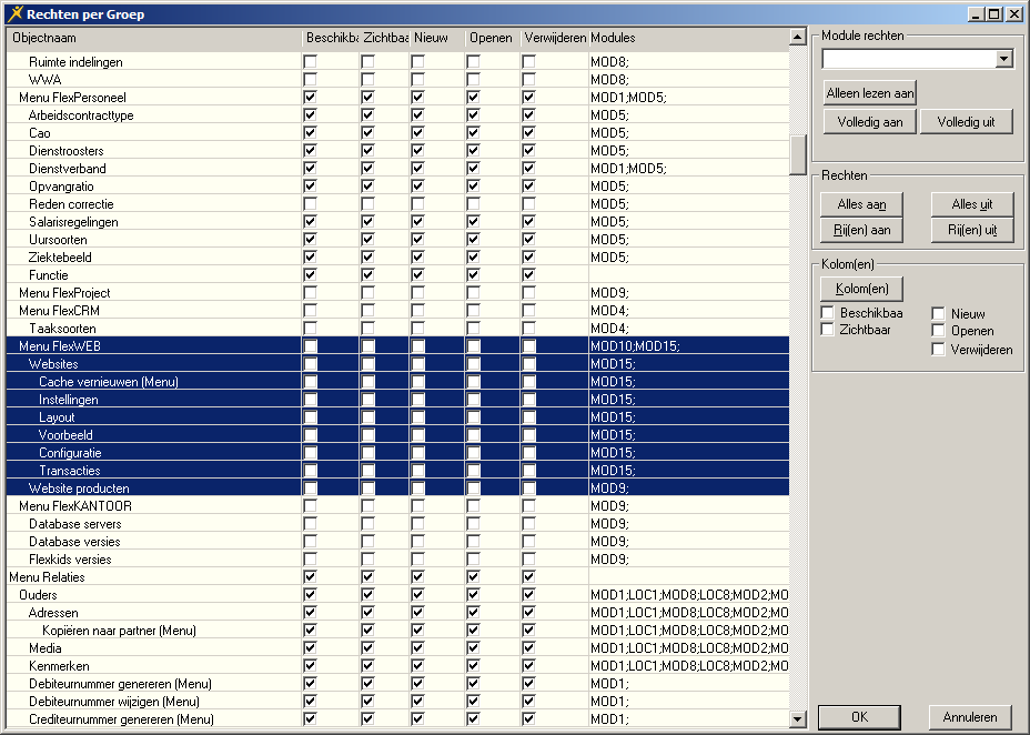 Let op! De activering van de onderdelen van de webportalen geldt voor iedere flexkids-gebruiker die lid is van de rechtengroep. Indien nodig kunt u een aparte rechtengroep aanmaken voor de beheerders.