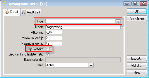 2. Selecteer het juiste type in keuzelijstveld Type behorende bij de opvangsoort.