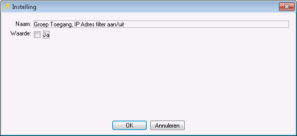 Op de flexweb webserver kunnen de IP-adressen van uw organisatie expliciet worden vastgelegd waardoor het niet mogelijk is om bij het Groepsportaal in te loggen via een onbekend IP-adres. U kunt van deze mogelijkheid alleen gebruik maken als uw organisatie over één of meerdere vaste externe IP-adressen beschikt. Als u van deze functionaliteit gebruik wilt maken geeft u de Website instelling Groep Toegang: IP adres fliter aan/uit de waarde Ja.