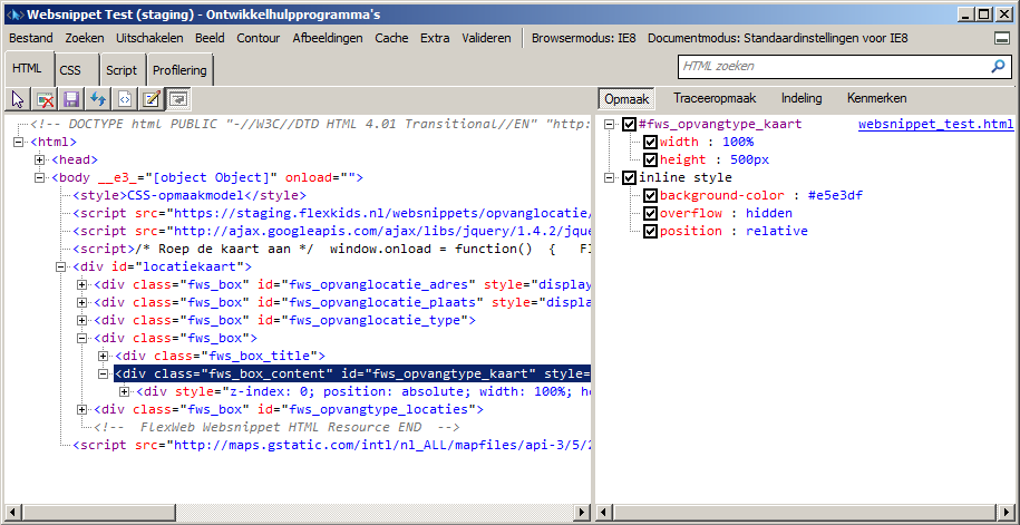 De websnippet wordt via javascript toegevoegd aan de desbetreffende webpagina van de website van de opvangorganisatie. Pas tijdens het laden van de webpagina wordt de html-code van de snippet gegenereerd. Het is dus niet mogelijk om de html van de snippet zelf te wijzigen. Uiteraard kunt u wel de html-code van de webpagina manipuleren. Om te zien waar in de html-code van de websnippet de diverse css-elementen van de css-stylesheet worden toegepast maakt u gebruik van de sneltoets F12 van Internet Explorer. U ziet dan het venster Ontwikkelhulpprogramma's: