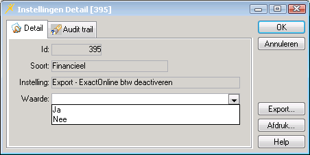 Met de instelling van deze parameter bepaald u dat bij export van de facturen de BTW niet meegenomen wordt voor het boekhoudpakket ExactOnline.