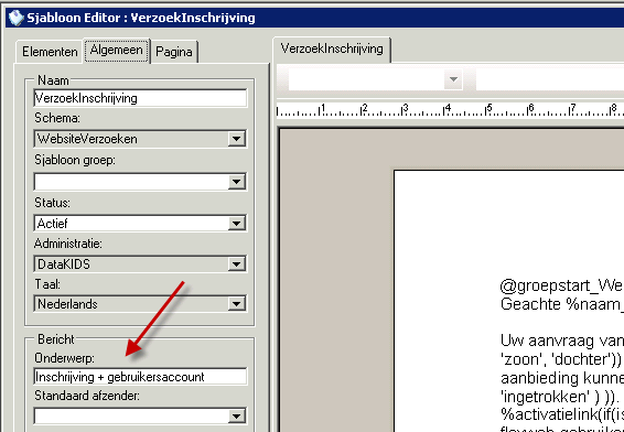 U kunt het onderwerp van de e-mailberichten waavoor het sjabloon is aangemaakt invullen op tabblad Algemeen van de sjablooneditor.