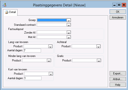 Als u de basale inrichting heeft afgerond kunt u per locatie de registratiegroep opgeven en de producten die moeten worden gebruikt bij het aanmaken van de plaatsing (op basis van de boeking in het klantportaal). Ook geeft u op welk contract daarbij moet worden gebruikt.