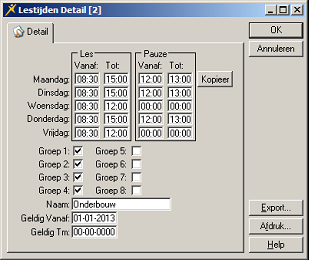 In flexkids kunt u in het school-informatiescherm de lestijden van de school opgeven (Relaties > Scholen > [selecteer school] > (tab) School) :