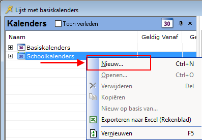 Bij het inrichten van de schoolkalenders maakt u eerst een algemene kalender waarin u de schooldagen toevoegd. In de lijst met basiskalenders maakt u via de optie Nieuw… in het contextmenu van Schoolkalenders een algemene kalender aan die de basis is voor de overige (school)kalenders.