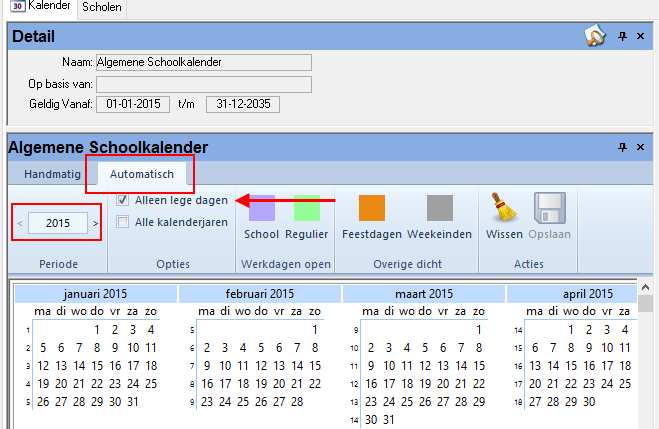 Klik op tabblad Automatisch enselecteer het betreffende jaar en vink het vakje Alleen lege dagen aan.