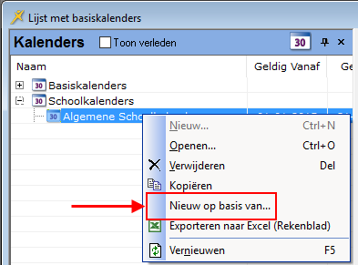 Klik op de Algemene Schoolkalender en kies Nieuw op basis van...