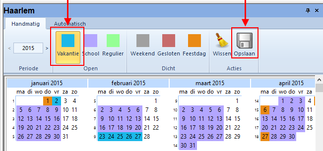 Geef de feestdagen aan. Klik hiervoor op het oranje vierkantje (Feestdagen). (*1)