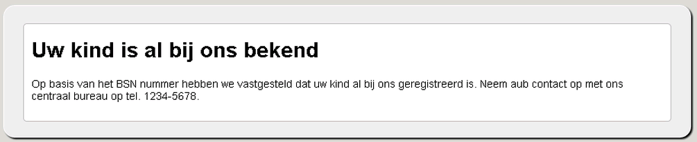 Deze melding dient aangepast te worden voor uw eigen organisatie. U maakt de aanpassingen in Beheer>FlexWEB>Website>[selecteer] website>(tab) Layout>(deelvenster) Sitemap. U komt bij de betreffende pagina's via Ouder>Hoofdpagina>Aanvraag>Tussenschoolse Opvang>Kindgegevens, Oudergegevens, Partnergegevens.
