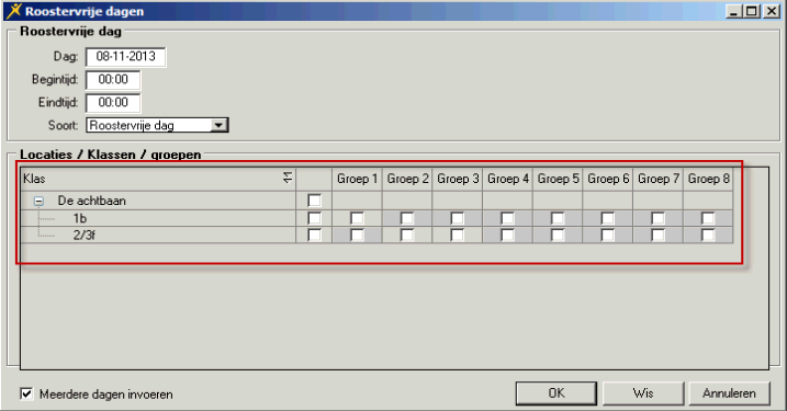 Wat de functie is van elk selectievakje wordt duidelijk als u de cursor boven het desbetreffende selectievakje beweegt. Zo kunt u aangeven dat de roostervrije dag geldt voor de gehele locatie of alleen voor groep 2 van klas 2/3f.