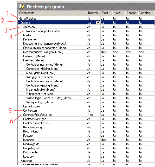 Het instellen van de rechten per onderdeel in het deelvenster Rechten per groep lichten we toe aan de hand van de beschrijving van een deel van de inhoud van dit deelvenster: