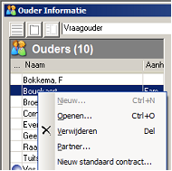 Als Beschikbaar is ingeschakeld dan hebben de laatste 3 opties van de regel betrekking op de menuopties Nieuw, Openen en Verwijderen in het contextmenu van het lijstvenster Ouders van het ouderinformatiescherm. Als in de regel bijvoorbeeld optie Nieuw is uitgeschakeld (ingesteld op Nee), dan zal de menuoptie Nieuw… in het contextmenu niet beschikbaar zijn: