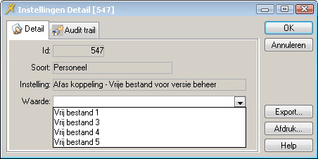 Dubbelklik op de regel Afas koppeling – Vrije bestand voor versiebeheer. U ziet het volgende venster: