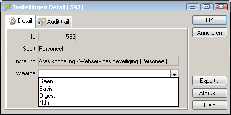 Met de systeemparameter Afas koppeling - Webservices beveiliging (Personeel) kunt u authenticatie beveiliging specificeren.