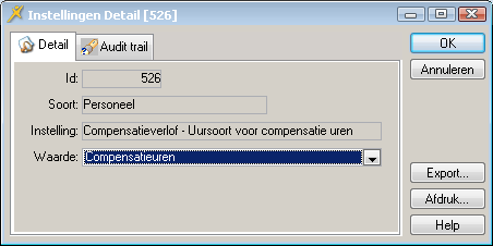 De standaard instelling bij Compenstatieverlof - Uursoort voor compenstatie uren staat ingesteld op Compensatieuren. Mocht deze waarde niet ingesteld zijn dan kunt u dit zelf doen. Deze instelling is alleen van belang voor ondernemingen die werken met compensatie-uren.