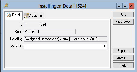 Het wettelijk verlof is minimaal 6 maanden geldig na afloop van het jaar waarin het is opgebouwd. Deze periode is het wettelijk minimum. U kunt deze periode verruimen door bij de systeemparameter Geldigheid in maanden wettelijk verlof vanaf 2012 een ander aantal maanden in te voeren. Als u géén waarde invoert zal flexkids met de termijn van 6 maanden rekenen.