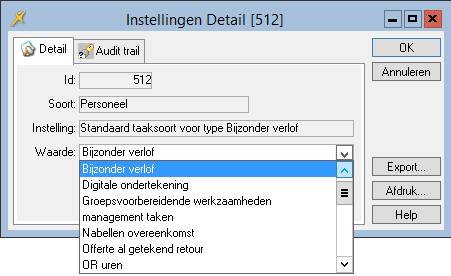 Om binnen flexkids standaard vast te leggen welke taaksoort u gebruikt voor het vastleggen van urenregistratie van Bijzonder verlof kunt u van onderstaande instelling gebruik maken. Hiermee zorgt u ervoor dat wanneer er voor een medewerker uren geregistreerd worden op deze taak automatisch de uursoort Bijzonder Velof gehanteerd worden voor de registratie.