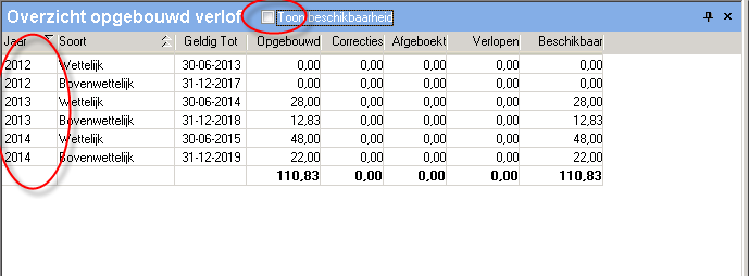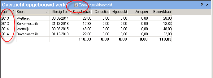 In het deelvenster Overzicht opgebouwd, onderdeel van de verloflofkaart van de medewerker vindt u het selectievakje Toon beschikbaarheid. Wanneer u dit selectievakje inschakelt wordt het overzicht getoond op basis van beschikbaarheid. Via de instelling Verlofsaldi / Standaard Toon beschikbaarheid aan kunt u ervoor zorgen dat dit vinkje altijd ingeschakeld is.