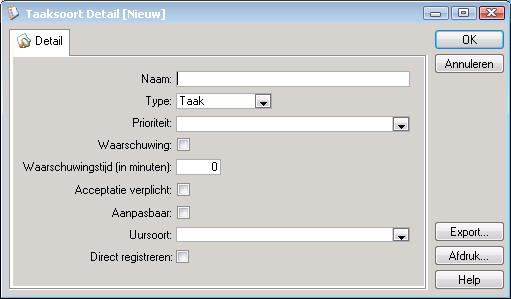 Klik met de RM-knop in de lijst met taaksoorten en kies Nieuw… U ziet het volgende scherm: