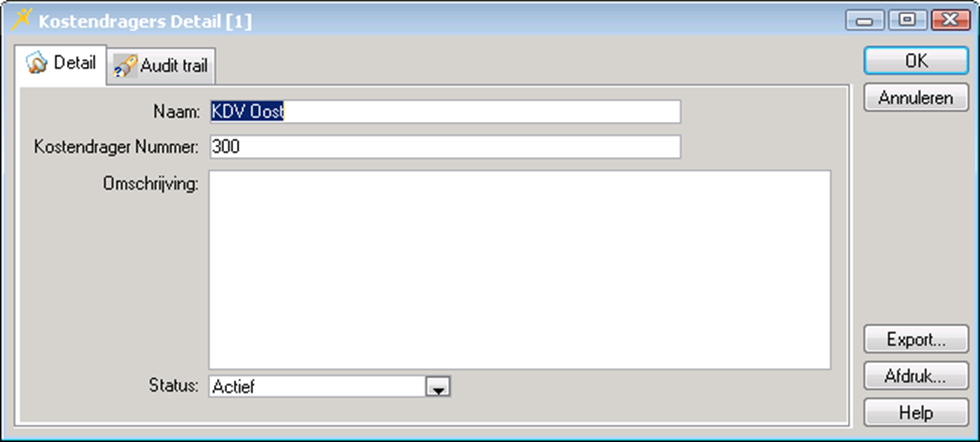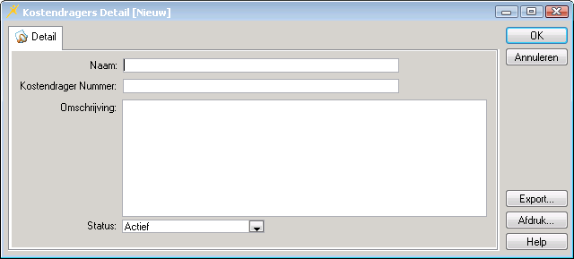 Klik met de RM-knop in de lijst met kostendragers en kies Nieuw… U ziet het volgende venster: