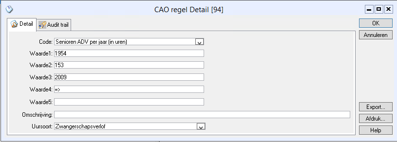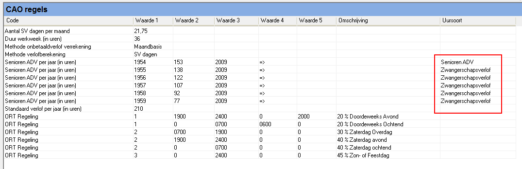 Nadat u de CAO geimporteerd heeft controleert u of de uursoort voor Senioren ADV daadwerkelijk op Senioren ADV staat. In een uitzondelijk geval wil het voorkomen dat de uursoort op Zwangerschapsverlof staat.