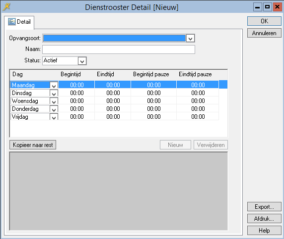 Voor het maken van een Dienstrooster voor een regio, cluster of locatie laat u het veld Opvangsoort leeg. |