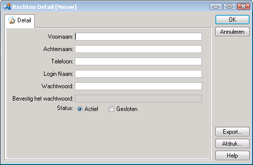 Klik met de RM-knop in het deelvenster Gebruikers en kies Nieuw… U ziet het venster Rechten Detail [Nieuw] . Vul bij Voornaam de voornaam van de medewerker in. Vul bij Achternaam de achternaam van de medewerker in. Vul bij Telefoon het telefoonnummer van de medewerker in. Dit veld is optioneel: u hoeft hier niets in te vullen. Vul bij Login Naam de naam in die de medewerker wil gebruiken als gebruikersnaam, de gebruikersnaam is niet hoofdletter gevoelig. Vul bij Wachtwoord het wachtwoord in dat de medewerker wil gebruiken, het wachtwoord id hoofdletter gevoelig. Druk op de TAB -toets. Hiermee activeert u het veld Bevestig het wachtwoord . Vul nogmaals hetzelfde wachtwoord in. Klik op OK .
