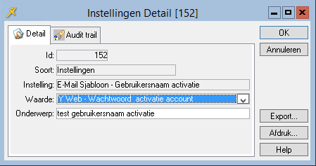 Met de parameter E-mail Sjabloon - Gebruikersnaam activatie stelt u in welk sjabloon gebruikt wordt voor het e-mailbericht dat naar de gebruiker wordt gestuurd zodra deze via het Klantportaal of het Medewerkersportaal heeft aangegeven dat hij zijn gebruikersnaam wil wijzigen.