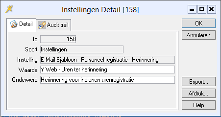 De leidinggevende kan de medewerker eraan herinneren dat deze haar urenregistratie nog niet heeft ingediend. De medewerker ontvangt van de verstuurde herinnering een E-mailbericht en een inboxbericht. Met de parameter E-mail Sjabloon - Personeel registratie - Herinnering stelt u in welk sjabloon gebruikt wordt voor het e-mailbericht en het inboxbericht dat naar de medewerker wordt gestuurd.