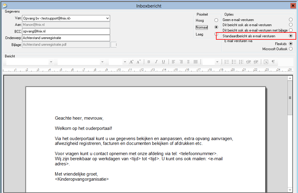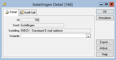 Bij de parameter INBOX - Standaard E-mail sjabloon kiest u het betreffende standaard bericht.