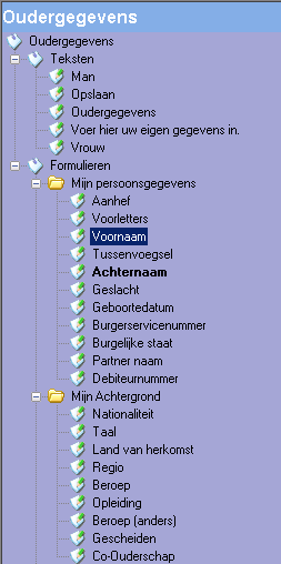 De velden zijn ingedeeld in twee groepen: Teksten en Formulieren. In groep Teksten vindt u de tekstvelden en in groep Formulieren de invoervelden van de formulieren op de webpagina.