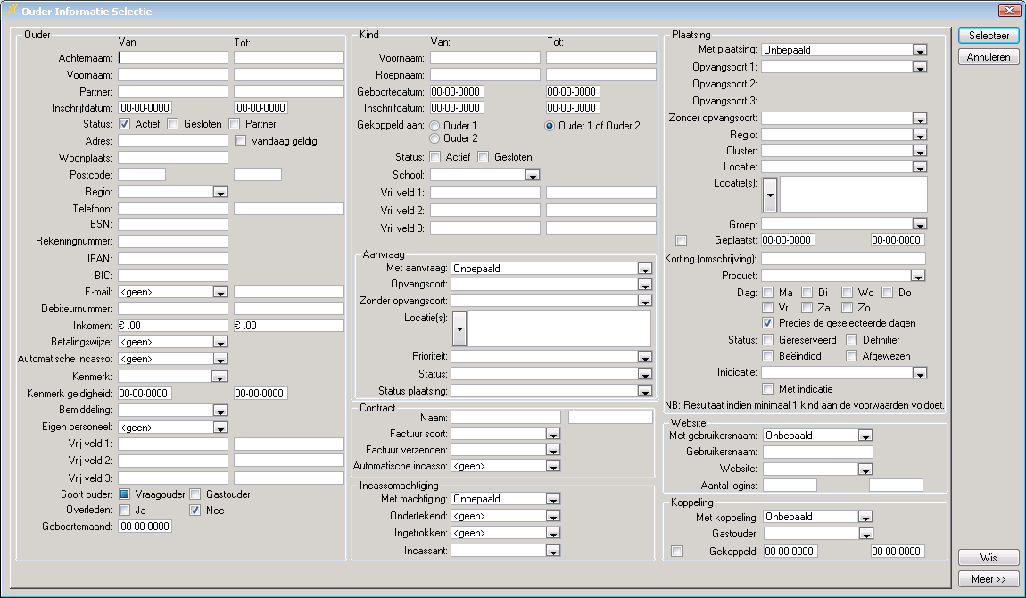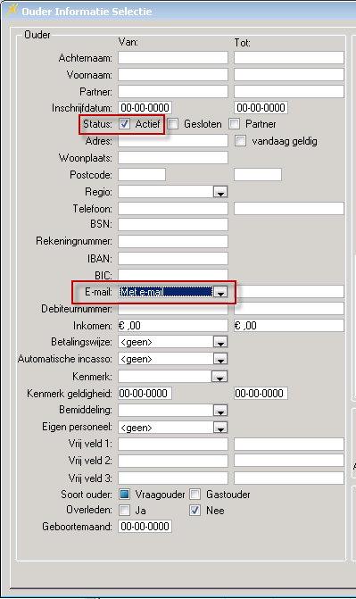 Met behulp van het selectievenster behorende bij een lijstvenster kunt u de lijst die wordt getoond heel gericht inhoud geven. Zo kunt u in bijvoorbeeld het lijstvenster ouders alleen die ouders tonen die de status actief hebben en een email adres hebben. Of in het lijstvenster Kinderen alleen die kinderen die geboren zijn na een bepaalde datum. Het gaat erom dat u de lijst met gegevens op basis van selectiecriteria kunt manipuleren zodat alleen gegevens worden getoond die op dat moment voor u relevant zijn.