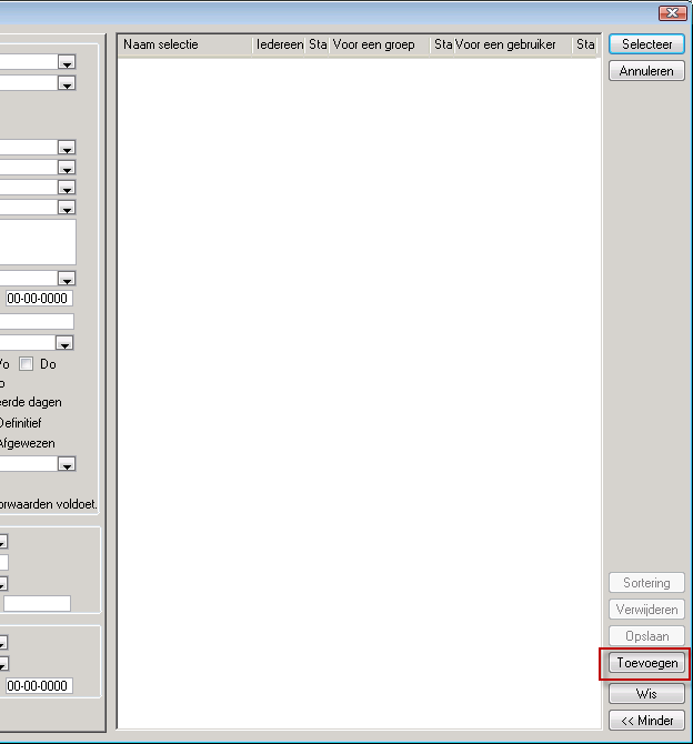 Voor het selecteren en weergeven van specifieke gegevensrecords. In het selectievenster kunt u de selectiecriteria opgeven op basis waarvan de gegevens zullen worden opgehaald uit de database. Selectievensters zijn standaard aanwezig in alle lijstvensters waarin gegevensrecords worden gepresenteerd aan de gebruiker.