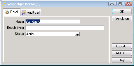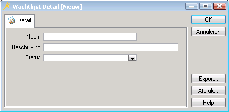 - Om een nieuwe wachtlijst aan te maken klikt u met de rechtermuisknop in de lijst met wachtlijsten en kiest Nieuw… U ziet het volgende scherm: