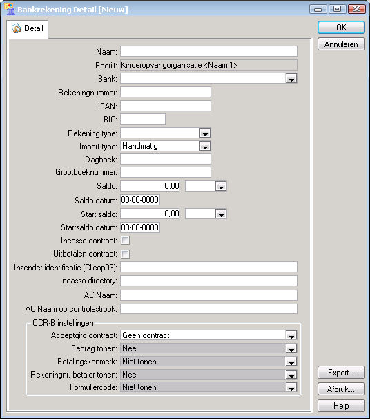 Klik met de rechtermuisknop in het venster Bankrekeningen en kies Nieuw… U ziet het volgende venster: