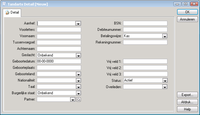 - Klik met de rechtermuisknop in de lijst met tandartsen en kies Nieuw… U ziet het volgende scherm: