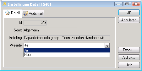 Dubbelklik op de regel Capaciteitsperiode groep – Toon verleden standaard uit . U ziet het volgende venster: