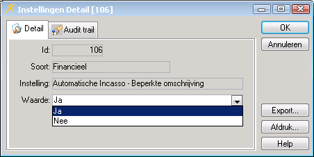 Met de instelling van deze parameter geeft u aan dat er bij het maken van een automatisch incassobestand (CLIEOP03) een beperkte omschrijving meegegeven moet worden. Doorgaans worden er per factuur een aantal regels opgeslagen. Voor de bank RABO geldt deze beperkte omschrijving, er worden vier regels per factuur opgeslagen.