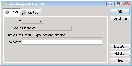 Met de instelling van deze parameter wordt een directory (map) opgegeven die wordt gebruikt om exportbestanden in op te slaan (export relaties en export facturen). De directory moet worden ingevoerd conform de UNC standaard voor naamgeving (Uniform Naming Convention). Raadpleeg eventueel uw systeembeheerder of onze supportafdeling als u niet weet welke waarde u in moet vullen.