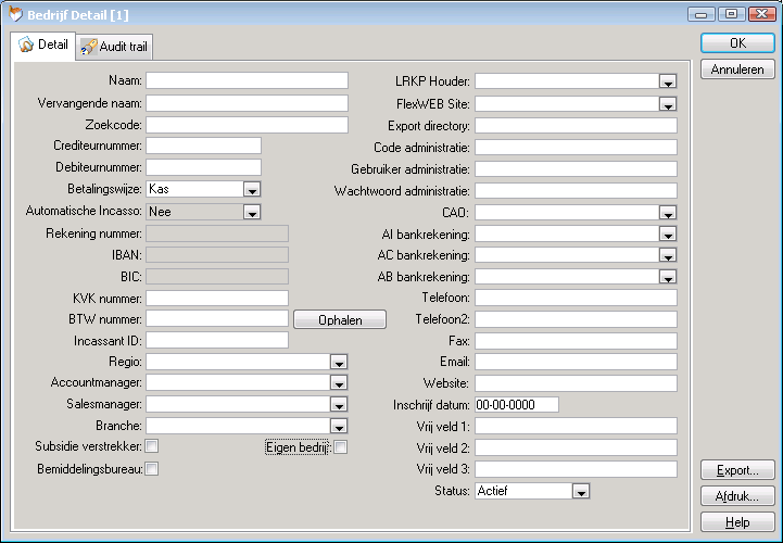 Het invoervenster Bedrijf Detail dat u gebruikt bij de invoer van bedrijfsgegevens ziet er als volgt uit: