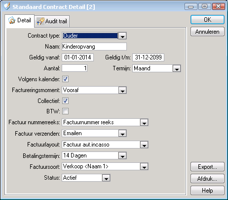 Voor nieuwe klanten is er een voorbeeld van een standaardcontract aanwezig in het systeem. U kunt dit standaardcontract controleren, aanpassen of verwijderen. Daarnaast kunt u zoveel standaardcontracten maken als u nodig hebt.