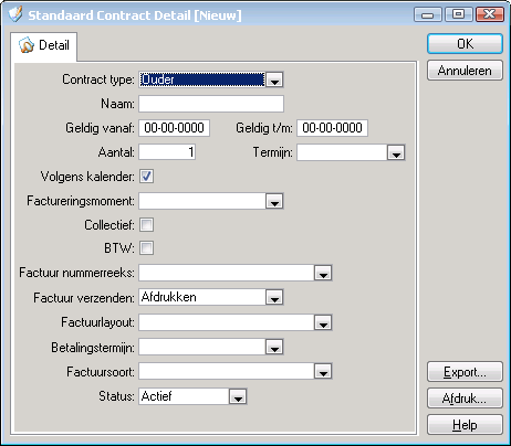Klik met de RM-knop in deelvenster Standaardcontracten en kies Nieuw... U ziet het volgende venster: