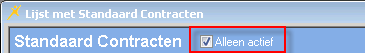 Bovenin de lijst met standaardcontracten vindt u het selectievakje Actief. Dit selectievakje is automatisch aangevinkt. Als u het selectievakje uitschakelt worden ook de gesloten standaardcontracten getoond.