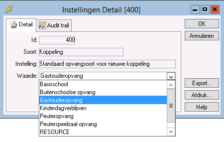 Met de instelling van deze systeemparameter zorgt u ervoor dat bij het aanmaken van een nieuwe koppeling het veld Opvangsoort automatisch is ingevuld.