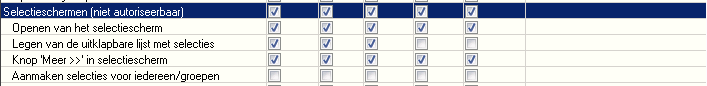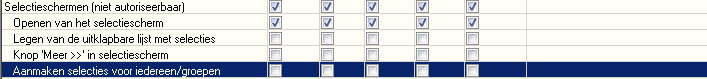 Rechten op selectieschermen waarbij bepaald is dat een gebruiker het selectiescherm mag openen, de selecties mag gebruiken, selecties voor zichzelf mag vastleggen maar geen selecties mag maken voor iedereen en/of groepen.