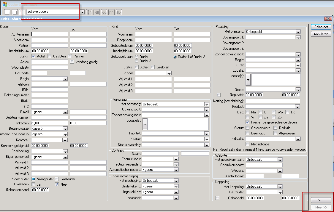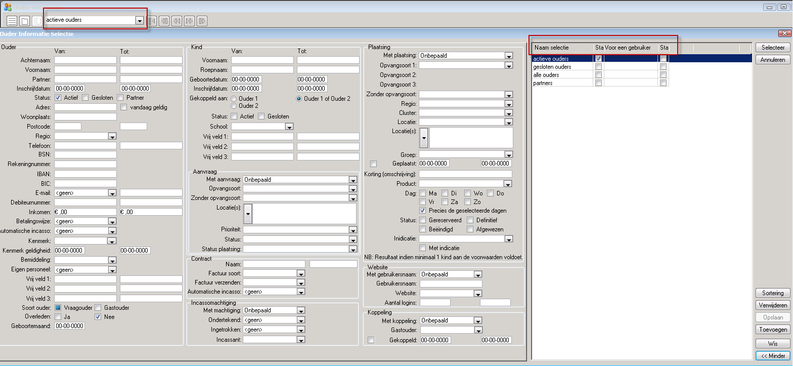De geruiker kan de vastgelegde selectie voor Actieve ouders in Ouder Informatie openen maar er niets in veranderen. De knop Meer kan niet gebruikt worden. Wél kan zij andere, eenmalige selecties maken binnen de informatieschermen.